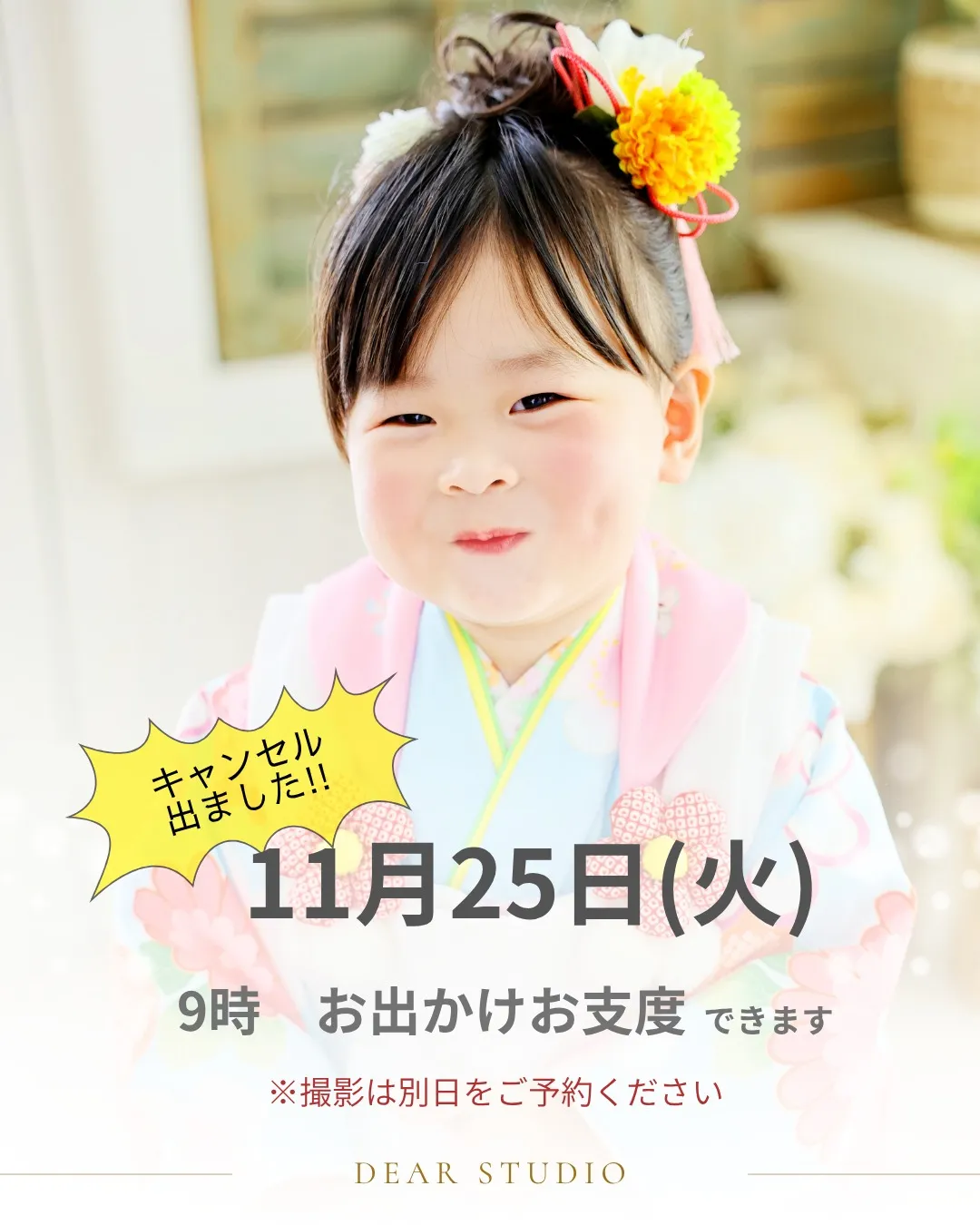 七五三撮影はお済ですか?毎日、とても賑やかなDEARSTUDIOです。土日祝日は、ご予約が取りにくくなってきておりますが平日は、まだ少し余裕があります。これから撮影をお考えの方オトクな平日がオススメ…