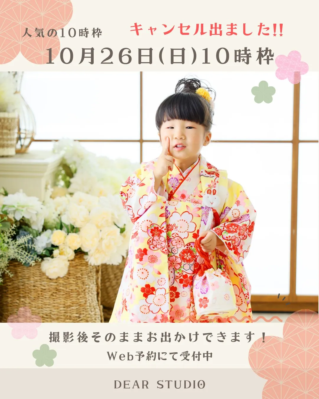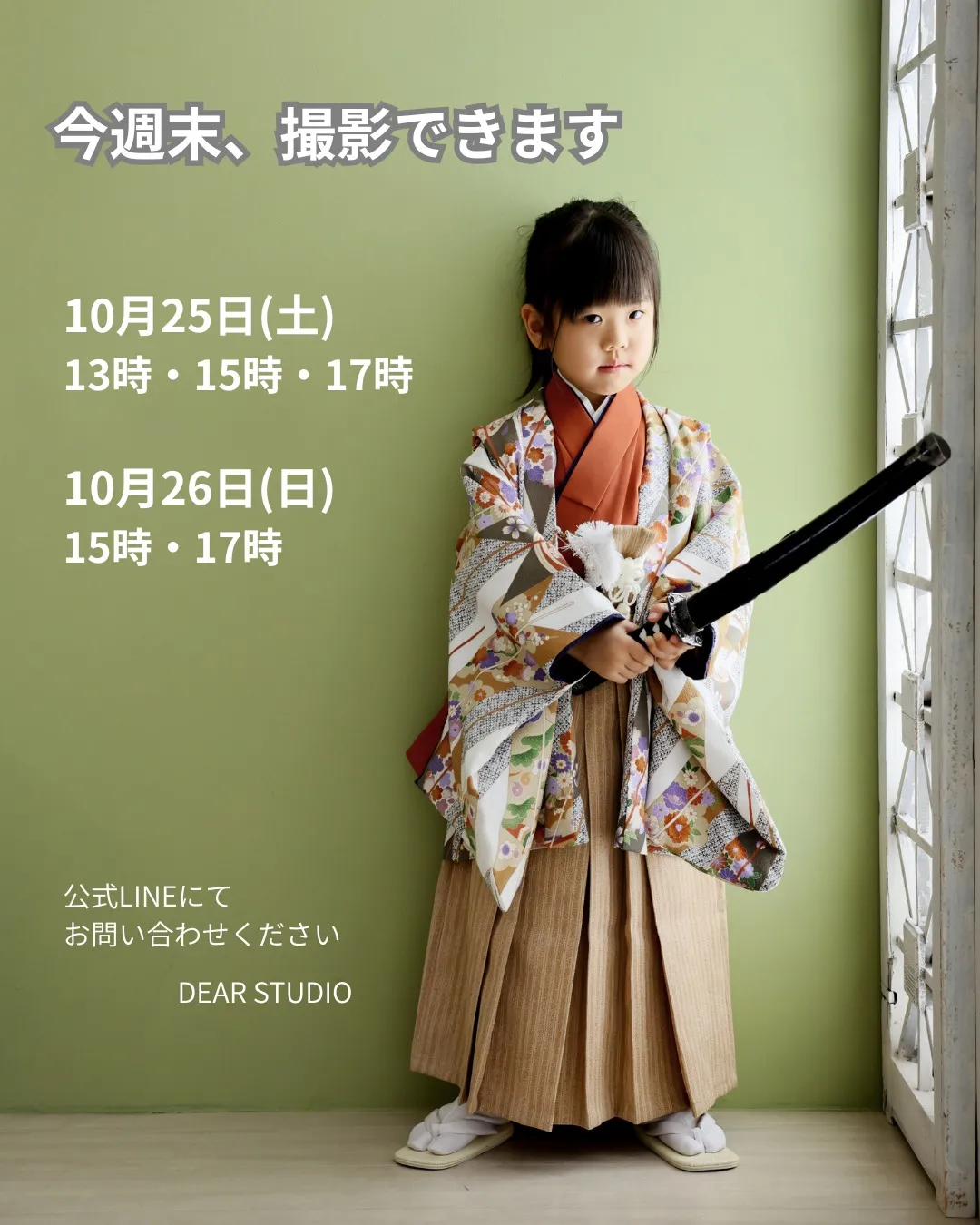 📸 今週末、撮影できます!! 📸今週末、撮影できます!!🍁10月25日(土)13時枠・15時枠・17時枠🍁10月26日(日)15時枠・17時枠七五三シーズンに入り、ありがたいことにご予約をたくさんいただいております。11月の週末は空き枠も少なくなっ…