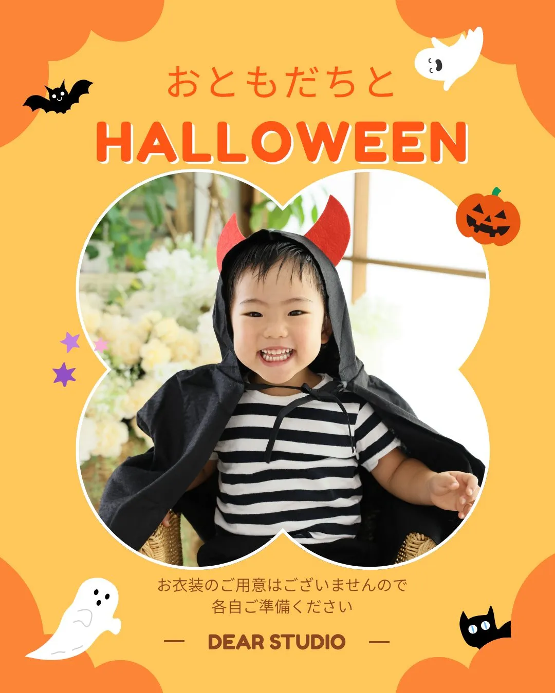 おともだちとHALLOWEEN🎃 おともだちとHALLOWEEN🎃なかよしのお友だちといっしょにスタジオで撮影しませんか?2組様から撮影ができます。完全貸切のスタジオで楽しい時間を過ごしましょう。仮装パーティーをDEARSTUDIOで🎃ちびっこ…