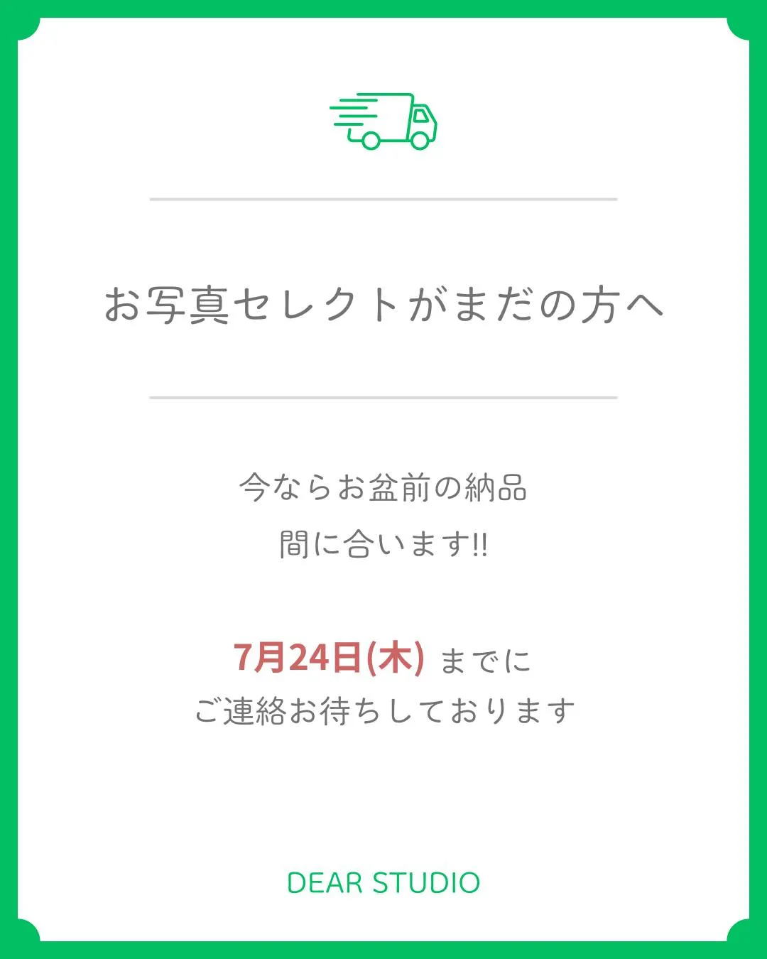 【購入商品のお写真セレクトがまだの方へ】 【購入商品のお写真セレクトがまだの方へ】お写真セレクトがまだの方お盆前の納品は7月24日(木)受付分までです。公式LINEにて、ご連絡ください。おじいちゃん、おばあちゃんへのプレゼントに間に合います…