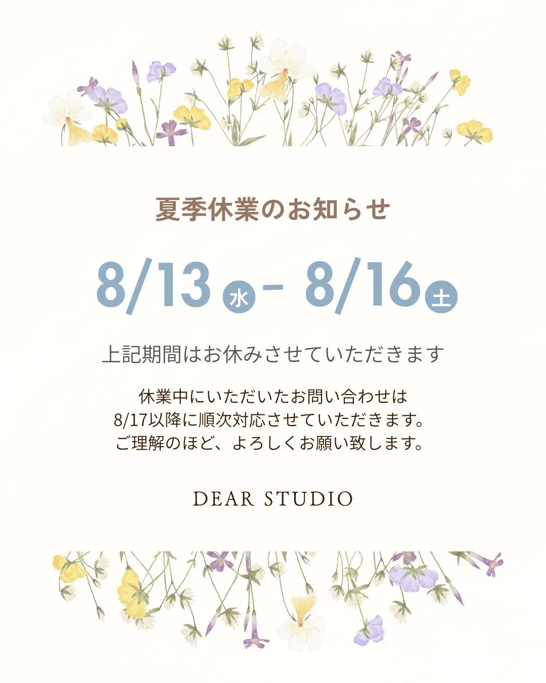 休業日のお知らせです。 休業日のお知らせです。DEARSTUDIOをご愛顧いただき誠にありがとうございます。誠に勝手ながら8月13日(水)~16日(土)までお休みさせていただきます。上記期間はお電話が繋がりませんのでお問い合わせはHP…