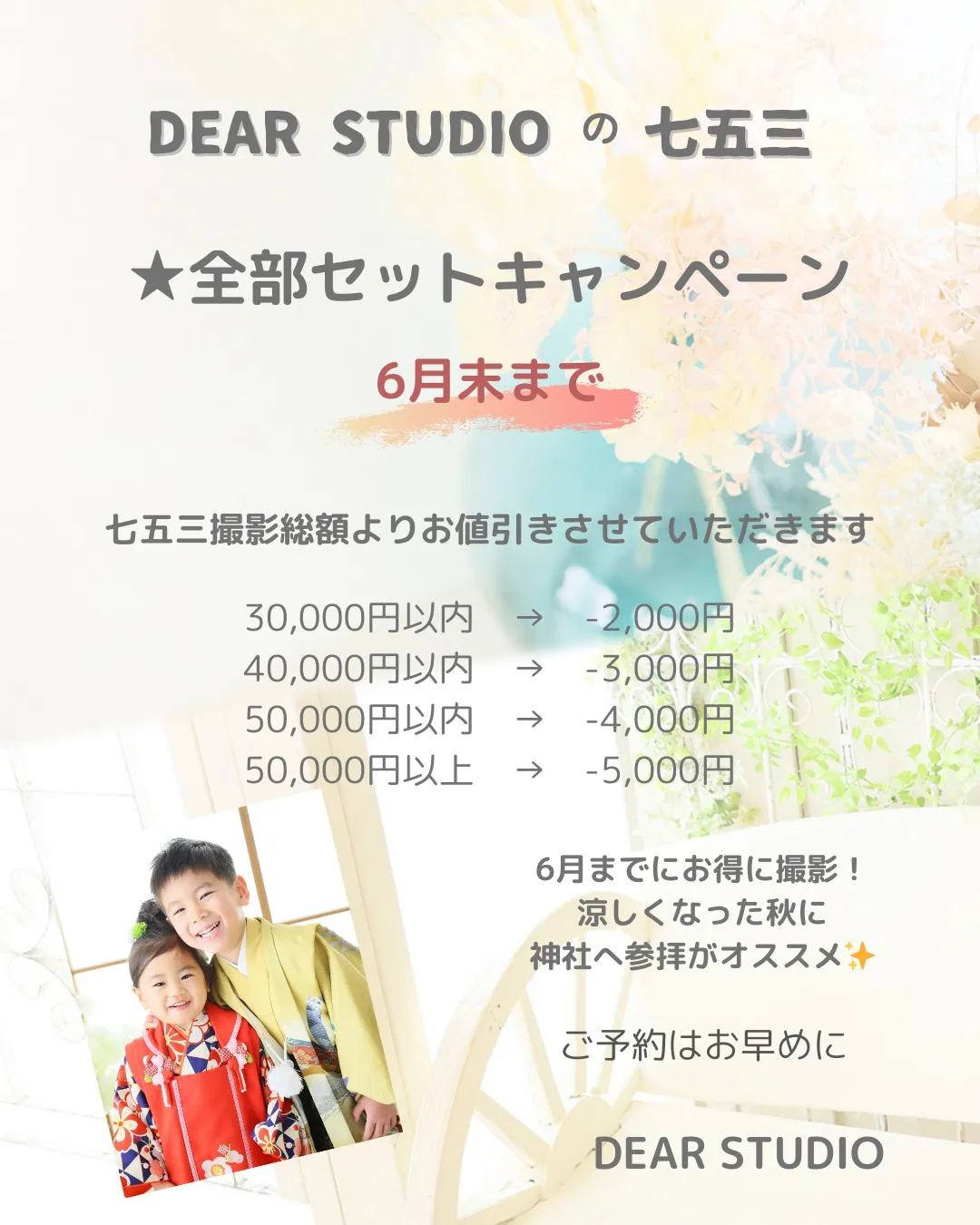 七五三全部セットキャンペーン』開催中です。今年、七五三を迎えるお子様また、昨年七五三撮影ができなかった方6月までのお得なプランです。七五三撮影の総額より、割引させていただきます。30,000円以内…