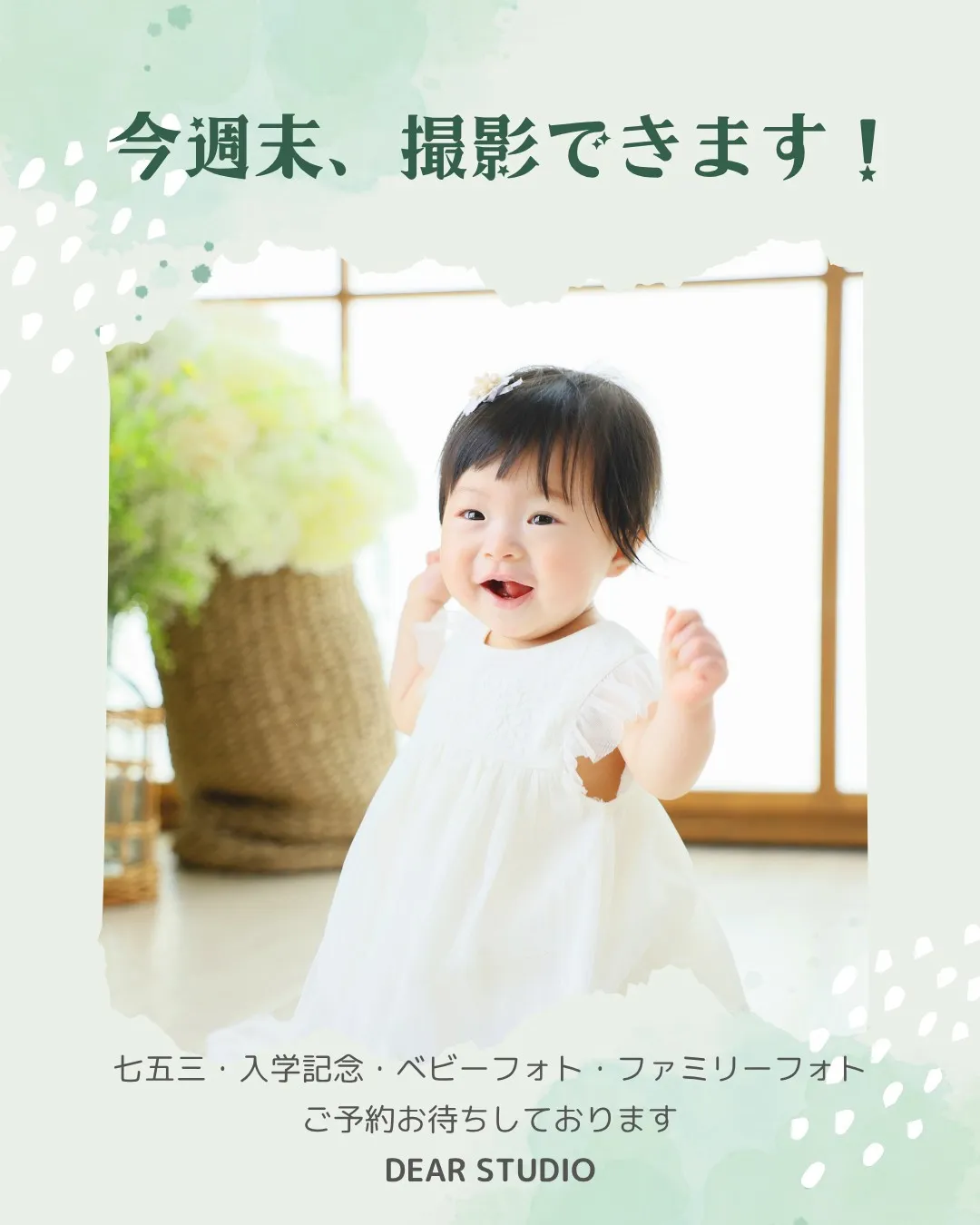 今週末、撮影出来ます‼七五三、卒業・入学、ベビーフォトおともだちプランも大歓迎✨️七五三全セットキャンペーンで、お得に撮影しませんか?前日の予約時刻まではWeb予約にてそれ以降は公式LINEへのご連…