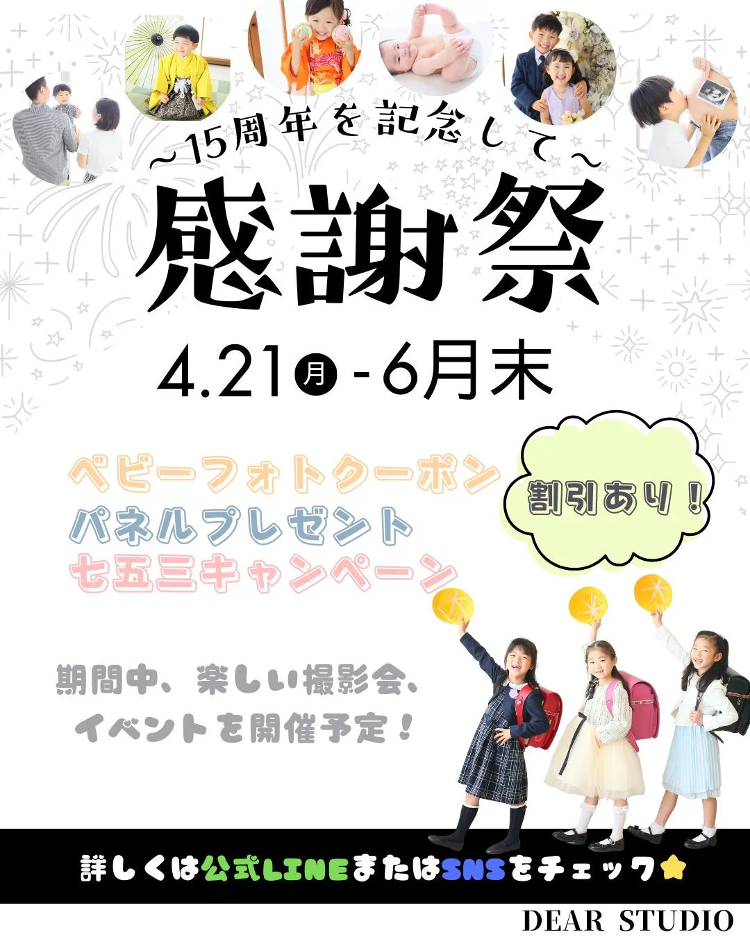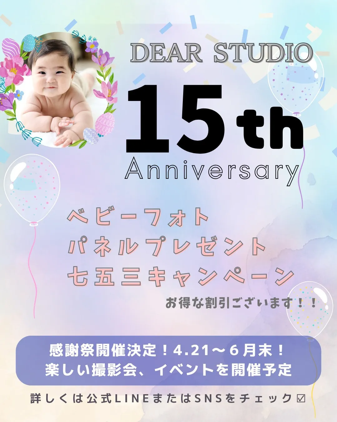 DEAR STUDIOは15周年を迎えました✨ DEARSTUDIOは15周年を迎えました✨皆様の温かいご支援ご愛顧のおかげです心より感謝申し上げますそこで日頃の感謝を込めて、感謝祭を開催します!!!!!楽しい撮影会、イベント、各種お得な割引などたく…