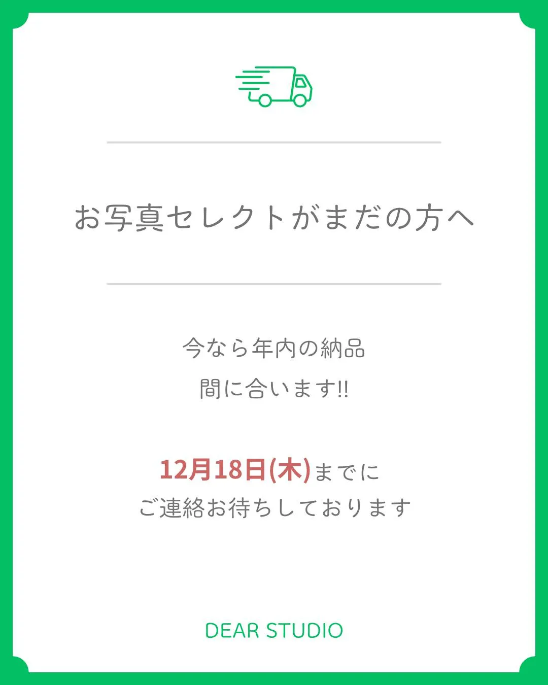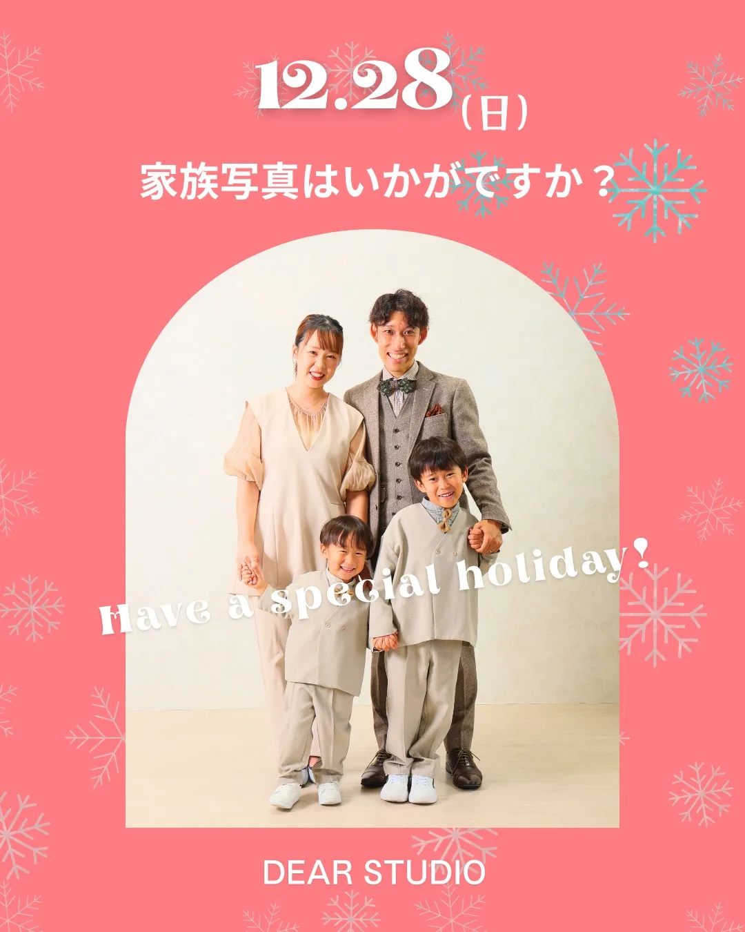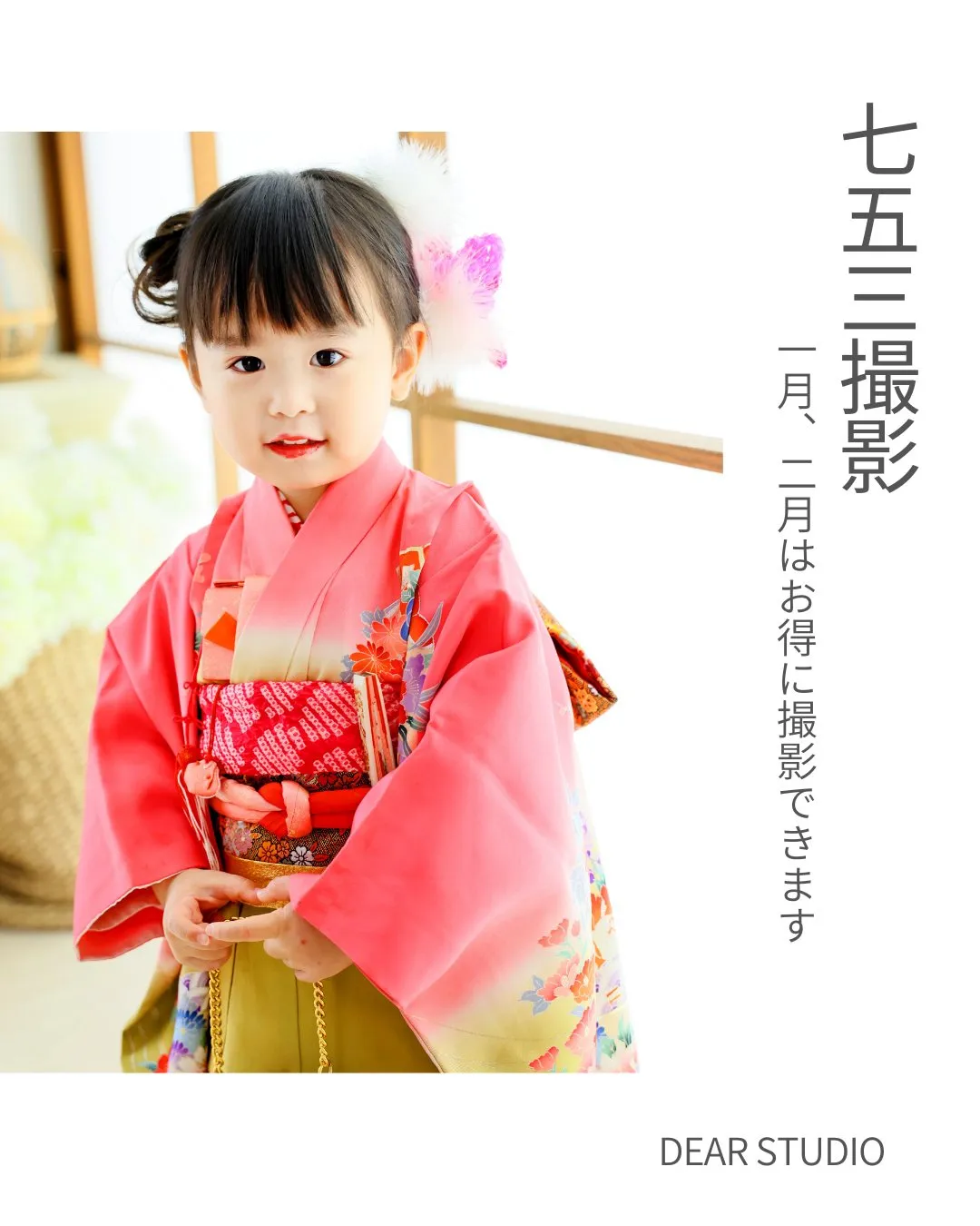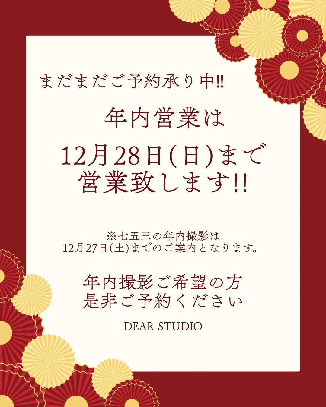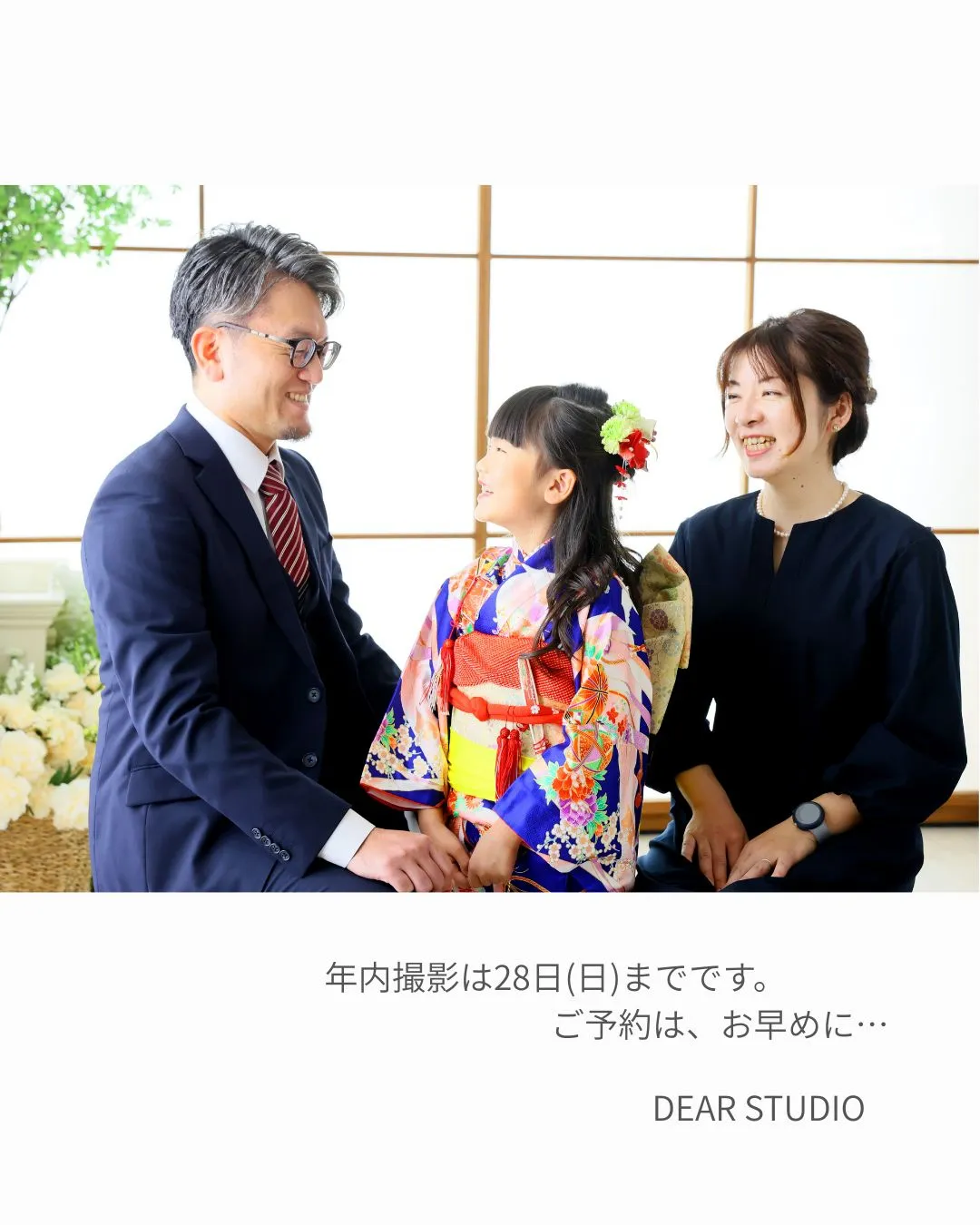 DEAR STUDIOをご愛顧いただき DEARSTUDIOをご愛顧いただき誠にありがとうございます。年内営業は12月28日(日)まで営業いたします。ただし、七五三の年内撮影は12月27日(土)までのご案内となります。年内撮影できなかった‼今年最後の思…