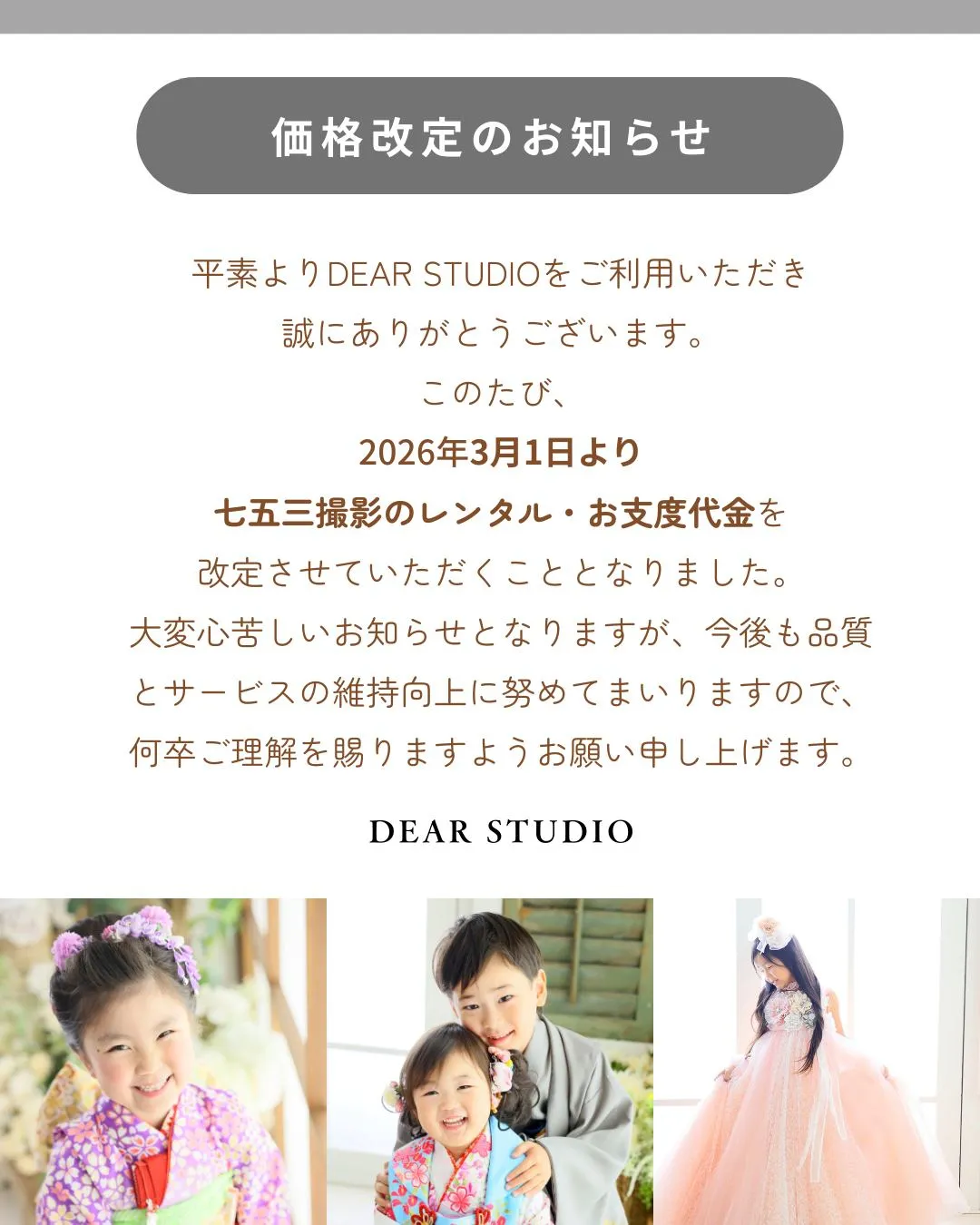 平素よりDEAR STUDIOをご利用いただき 平素よりDEARSTUDIOをご利用いただき誠にありがとうございます。DEARSTUDIOよりお知らせです。🎉七五三撮影のご予約をご検討中の方へ🎉お支度料金は2026年3月1日より改定となります。今なら2月末まで、現在…