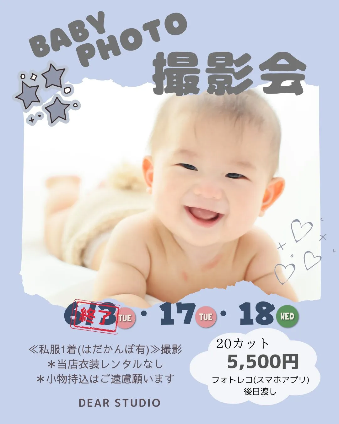大好評!!ベビーフォト撮影会✨️ 大好評!!ベビーフォト撮影会✨️6月17日(火)原店1時間1組18日(水)原店1時間1組0歳から1歳までのお子様、おひとりのお写真限定着せたいお洋服1着(はだかんぼ撮影有)となります!※衣装レンタルはありませ…