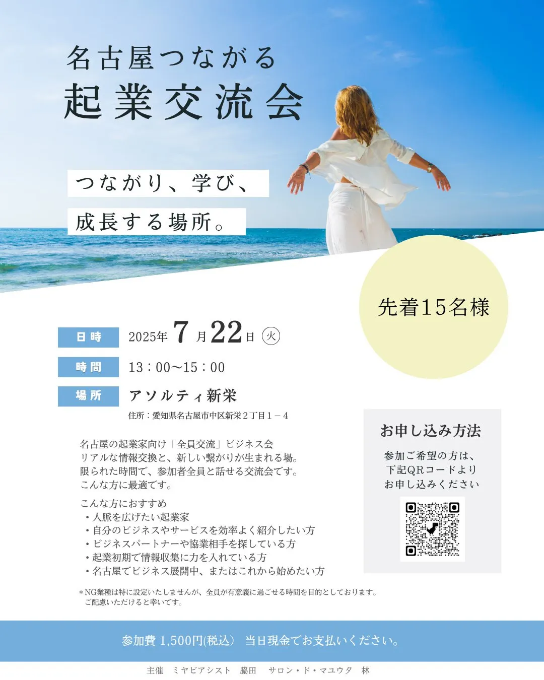 名古屋に“本気でつながる”起業家交流会が誕生!「名古屋つながる起業交流会」第2回開催決定✨📅7月22日(火)13:00〜15:00📍新栄町駅すぐ/アソルティ新栄👥先着15名限定(少人数・全員と話せる!)💰参加費:1,…